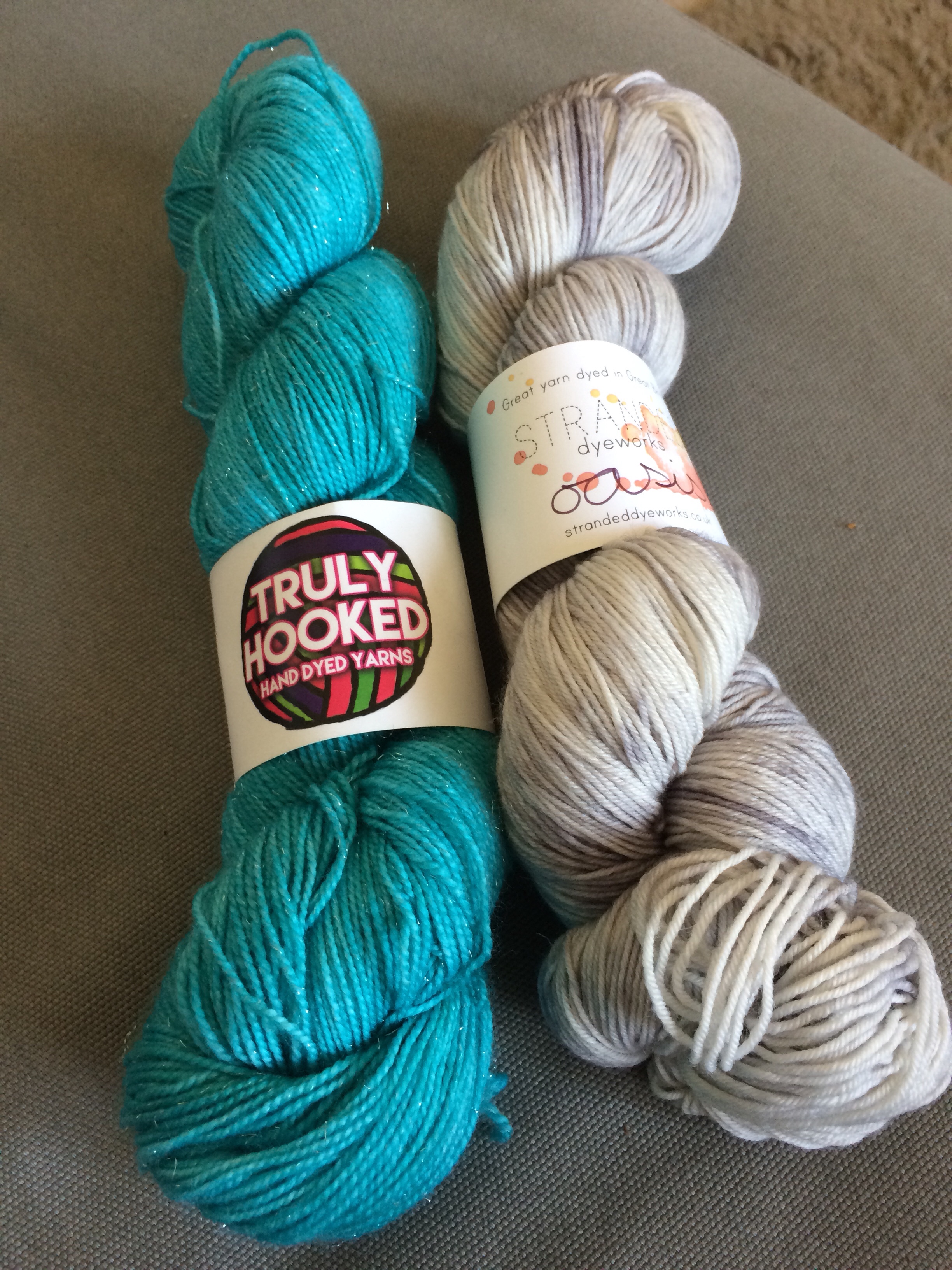 I’m also taking yarn to knit a Byatt shawl – one skein of Stranded Dyework’s Oasis I’m Spook (bought at a showcase at my local yarn store last LYS day) and one skein of Truly Hooked’s Sparkle Sock in Jade (Bought at Yarndale last year). I’ll use the Stranded Dyeworks as the Main Colour and the Sparkle for the Contrast. Quite looking forward to starting it.