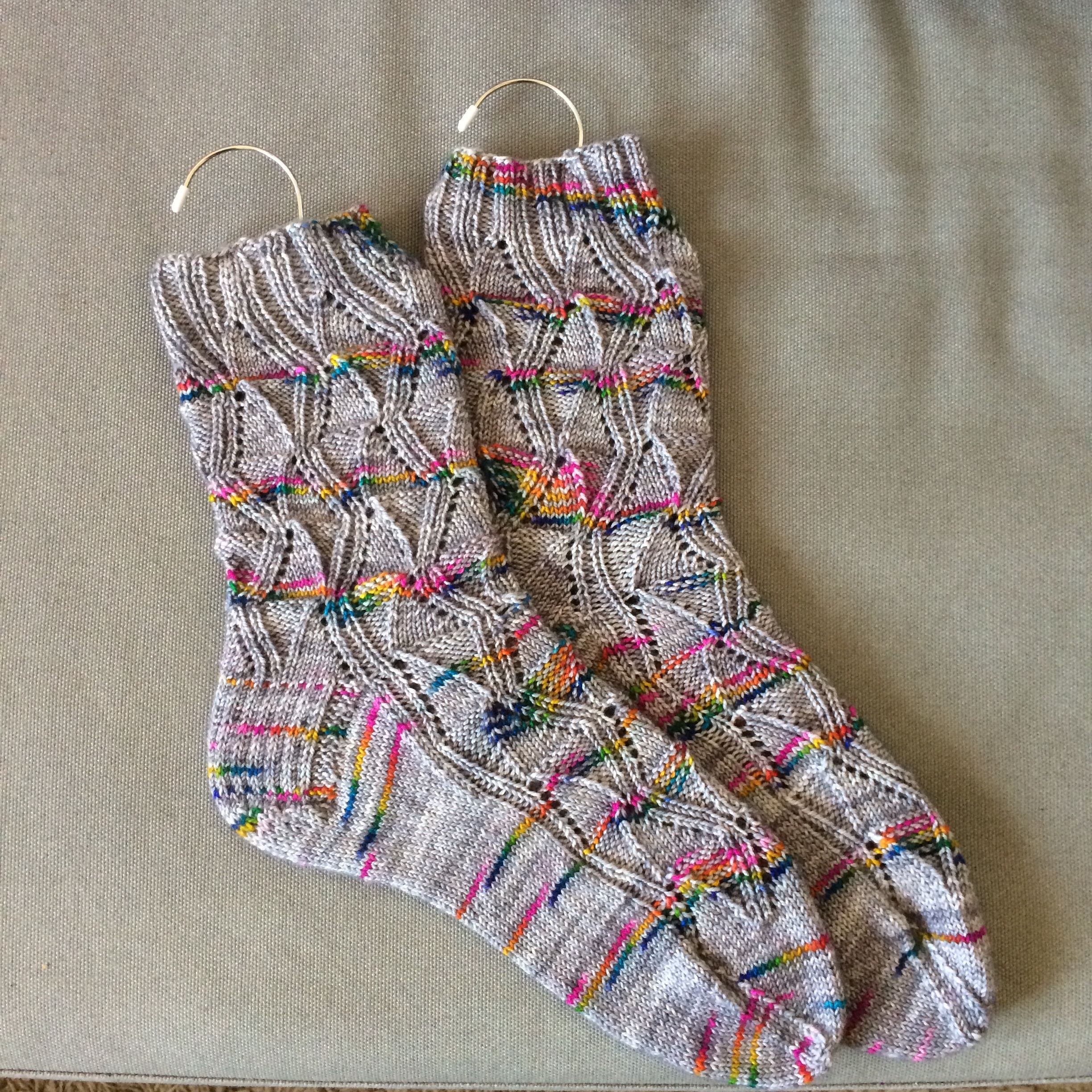 But, luckily, I had some socks to wrangle in preparation for this eventuality! Below are my completed (and unmissable, even in the boxes) uneek toe up socks. They’re definitely eye catching and I’m quite glad I went for a vanilla sock as I think any patterning would have been overwhelmed by the colours and colour changes.